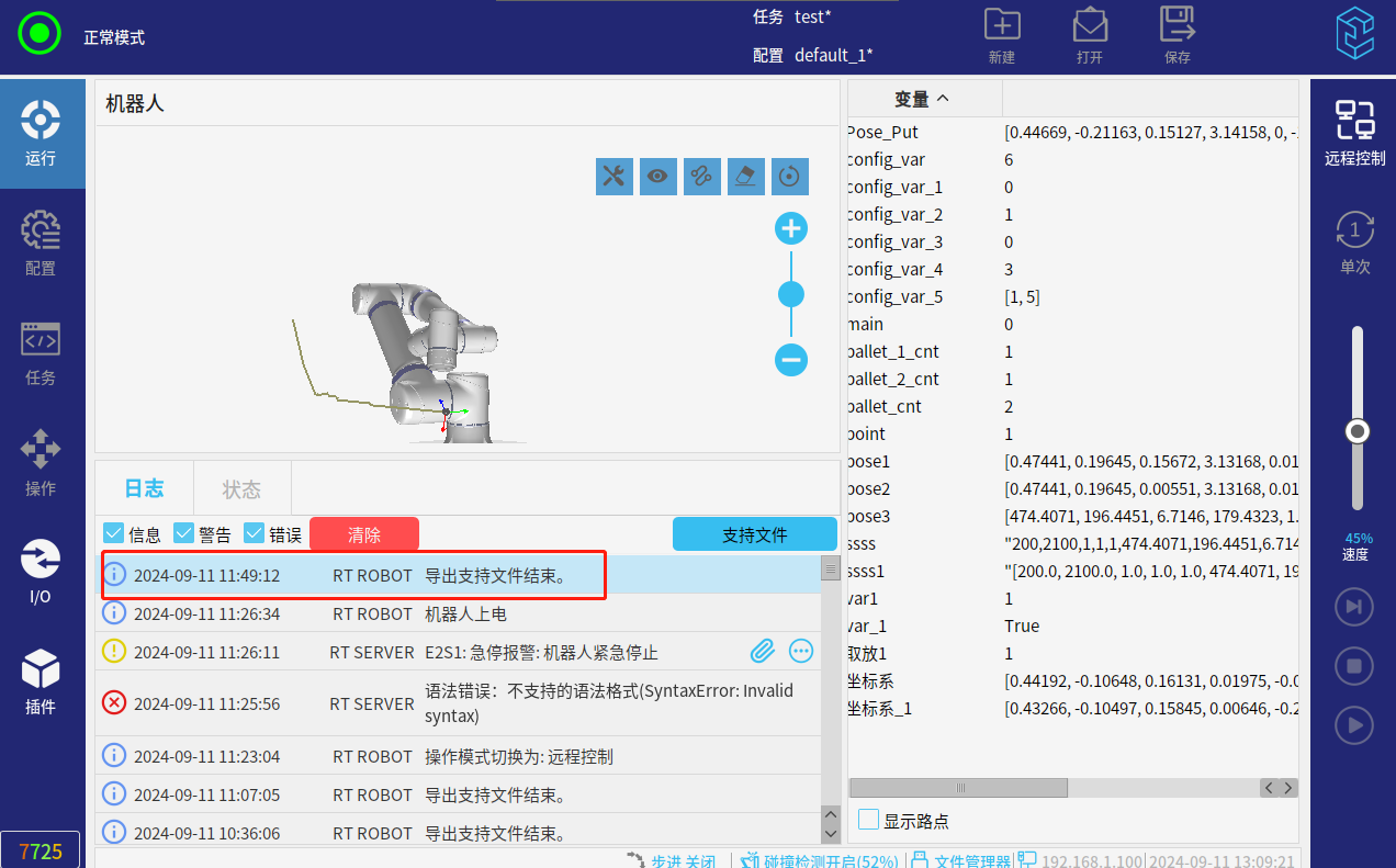 发送后机器人应该会按照脚本指令运动,无论是否运动,我们都可以导出支持文件查看: